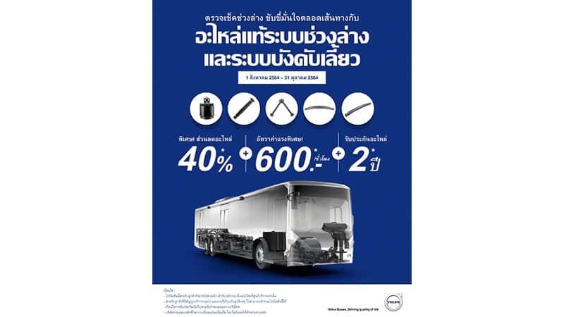 บริษัท วอลโว่ บัส (ประเทศไทย) จำกัด ซึ่งเป็นผลิตและจัดจำหน่ายรถบัสสายพันธุ์สวีเดน วอลโว่ บัส อย่างเป็นทางการในประเทศไทย จัดโปรโมชันพิเศษอย่างต่อเนื่องสำหรับรถวอลโว่ บัส ทุกคันที่เปลี่ยนนำรถเข้ารับบริการเปลี่ยนชิ้นส่วนระบบช่วงล่างและระบบบังคับเลี้ยวที่ศูนย์บริการทั้ง 15 สาขา โดยรับส่วนลดทันที 40% พร้อมระยะประกัน 2 ปีเต็ม